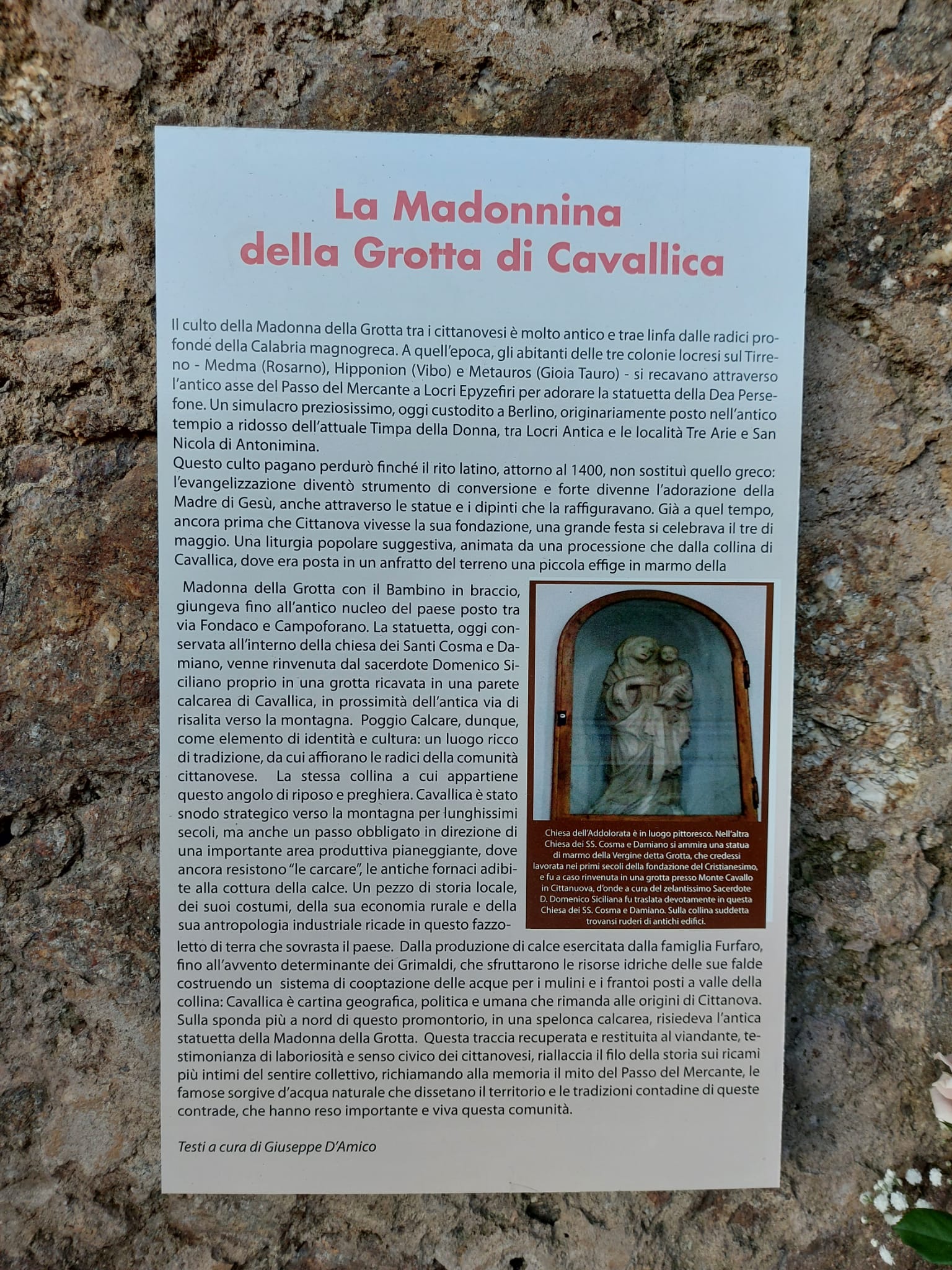 Dopo la benedizione da parte del parroco, don Letterio Festa, il nostro concittadino Giuseppe D’Amico ha ricordato i precedenti del culto di Maria SS. della Grotta in Cittanova e l’importanza culturale e sociale dell’evento.