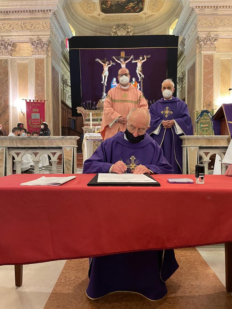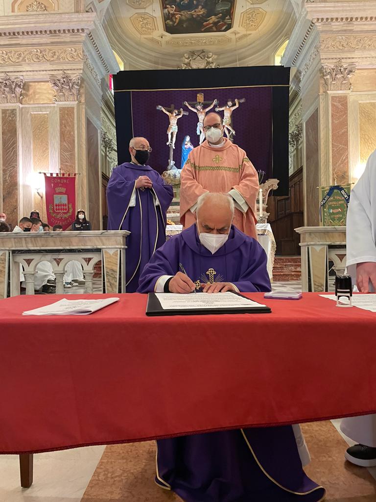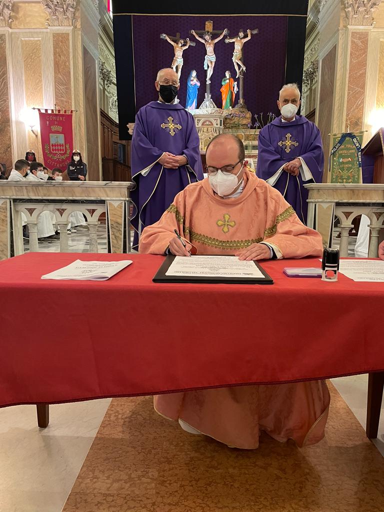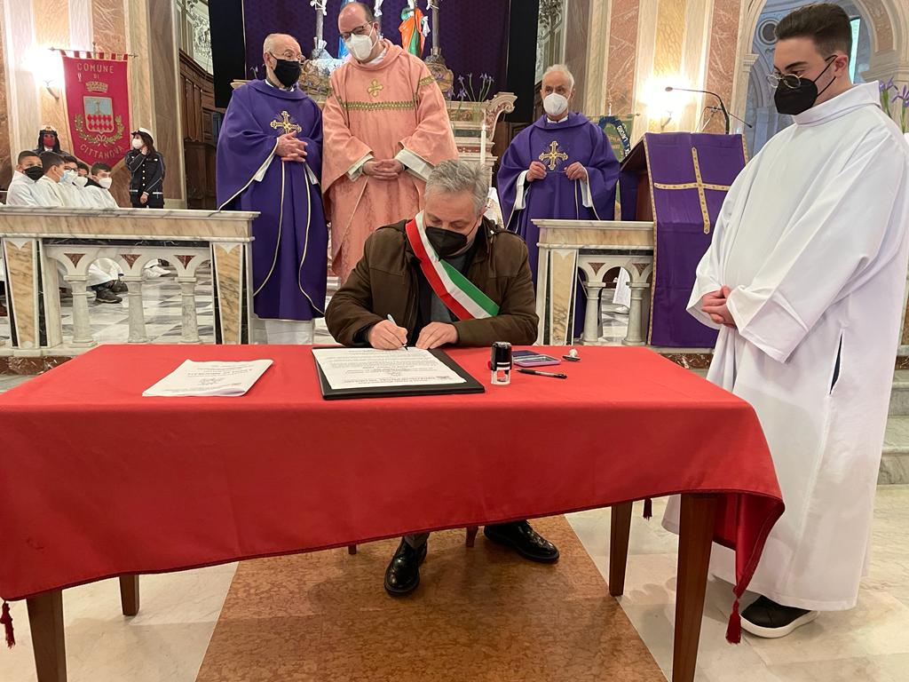 Quindi, Domenica 27 marzo, nel contesto della IV Domenica di Quaresima, alla presenza delle Autorità civili e militari e di un grande numero di Bambini che hanno riempito le navate della Matrice, c’è stato il solenne rinnovo del Patrocinio nella Santa Messa solenne delle ore 10:30 durante la quale c’è stata la lettura del rescritto del 1922; la stesura e la firma del nuovo atto di affidamento da parte del Clero e del Sindaco, sig. Francesco Cosentino, a nome del Popolo cittanovese e l’omaggio floreale del Sindaco e dei Bambini a nome della Comunità. I nomi dei Bambini presenti sono stati inseriti in un libro che è stato posto ai piedi della venerata effigie dell’Immacolata come simbolo di tutto il nostro Popolo.